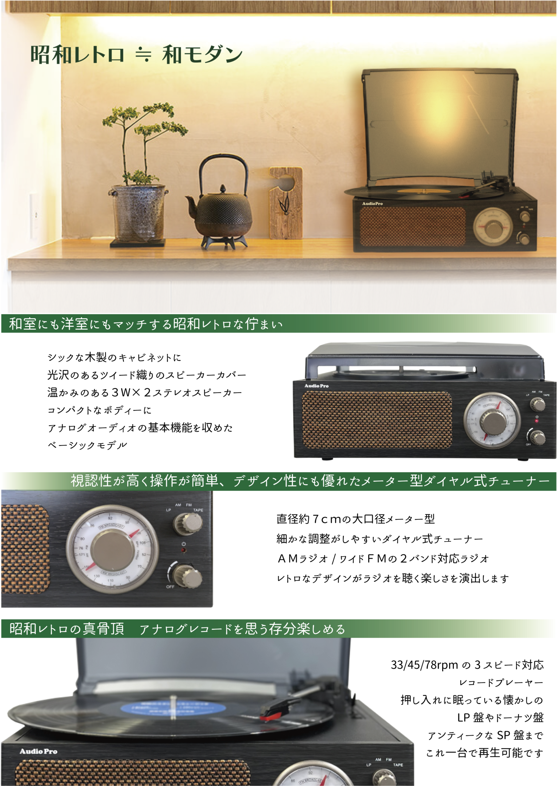 和室にも洋室にもマッチする昭和レトロなデザインのレコードプレーヤー
