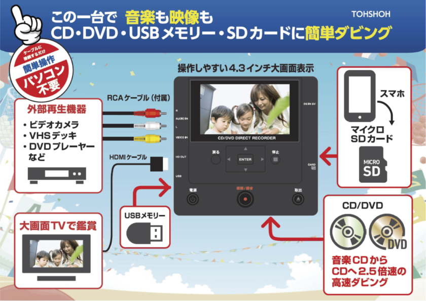 ビデオデッキ、ビデオカメラをつないでさまざまな記録メディアにデジタル保存。音楽CDからCD-R/RWへの倍速ダビングも可能