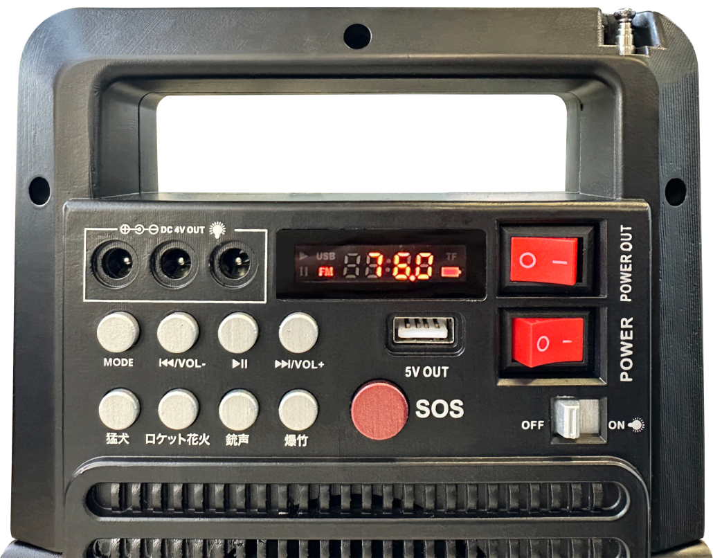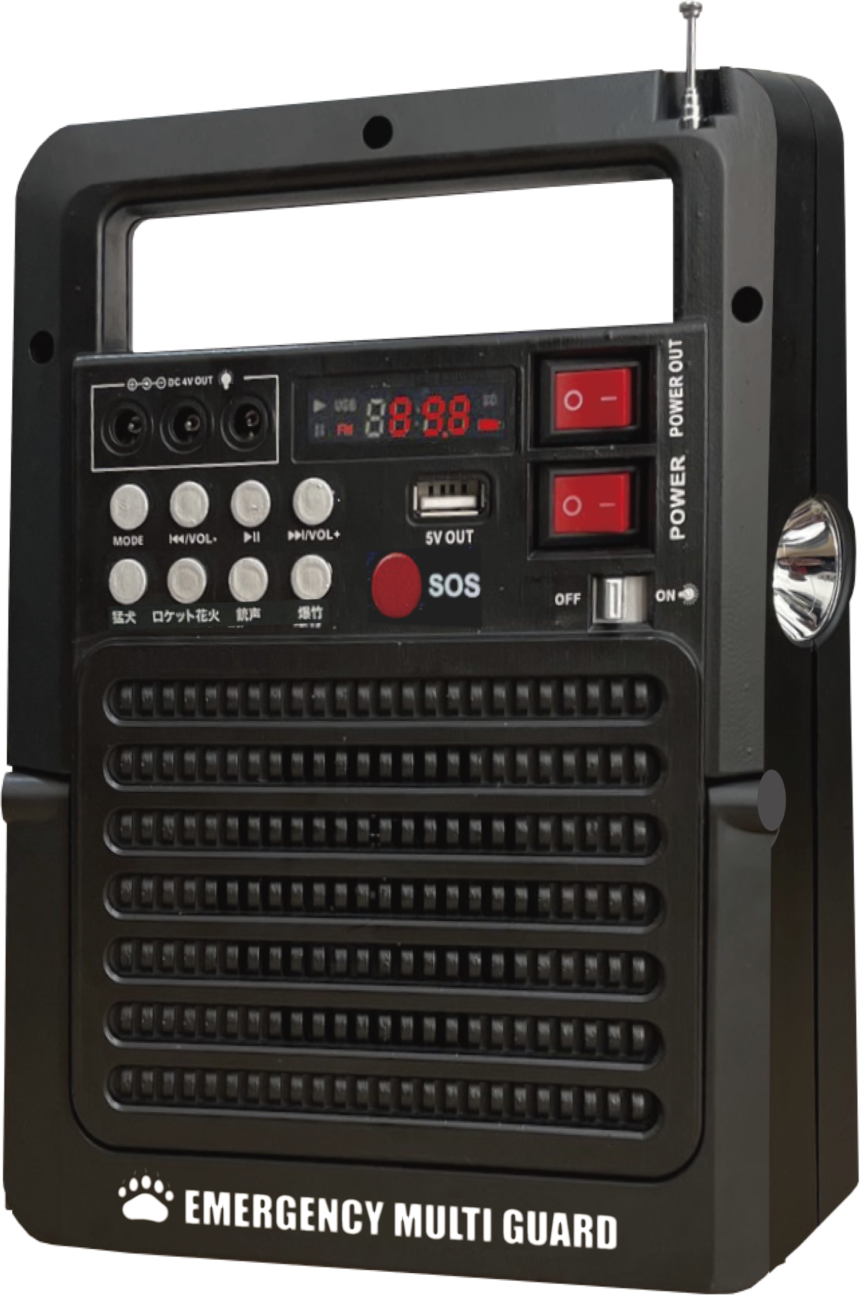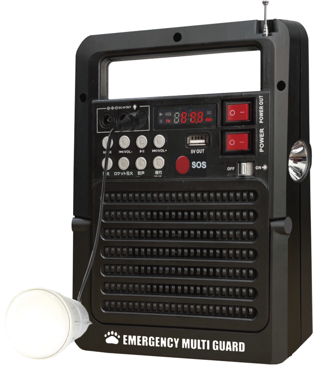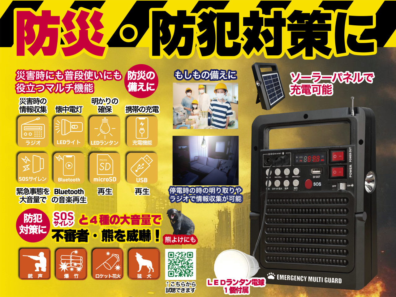 いつ発生するかわからない大災害に備えて…停電時に便利なソーラー充電式多機能バッテリー。緊急事態を周囲に伝えるSOSサイレンに加えて、4種の大音量で昨今増加する熊や不審者を威嚇!LEDライト/LEDランタン/FMラジオ/USB・microSD再生/Bluetooth受信機能を搭載、普段使いにも最適な1台